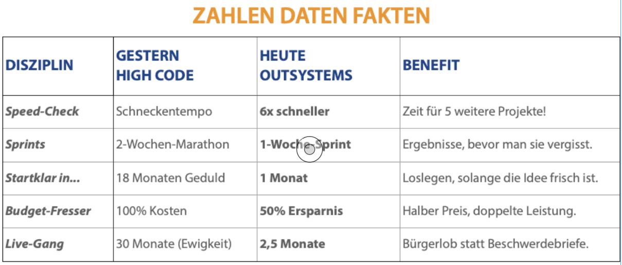 Mit dem Rahmenvertrag „Low Code für die öffentliche Hand“ können Behörden und Institutionen OutSystems ohne eigene Ausschreibung direkt abrufen. Das spart Zeit, reduziert Bürokratie und ermöglicht eine schnelle Umsetzung digitaler Projekte.